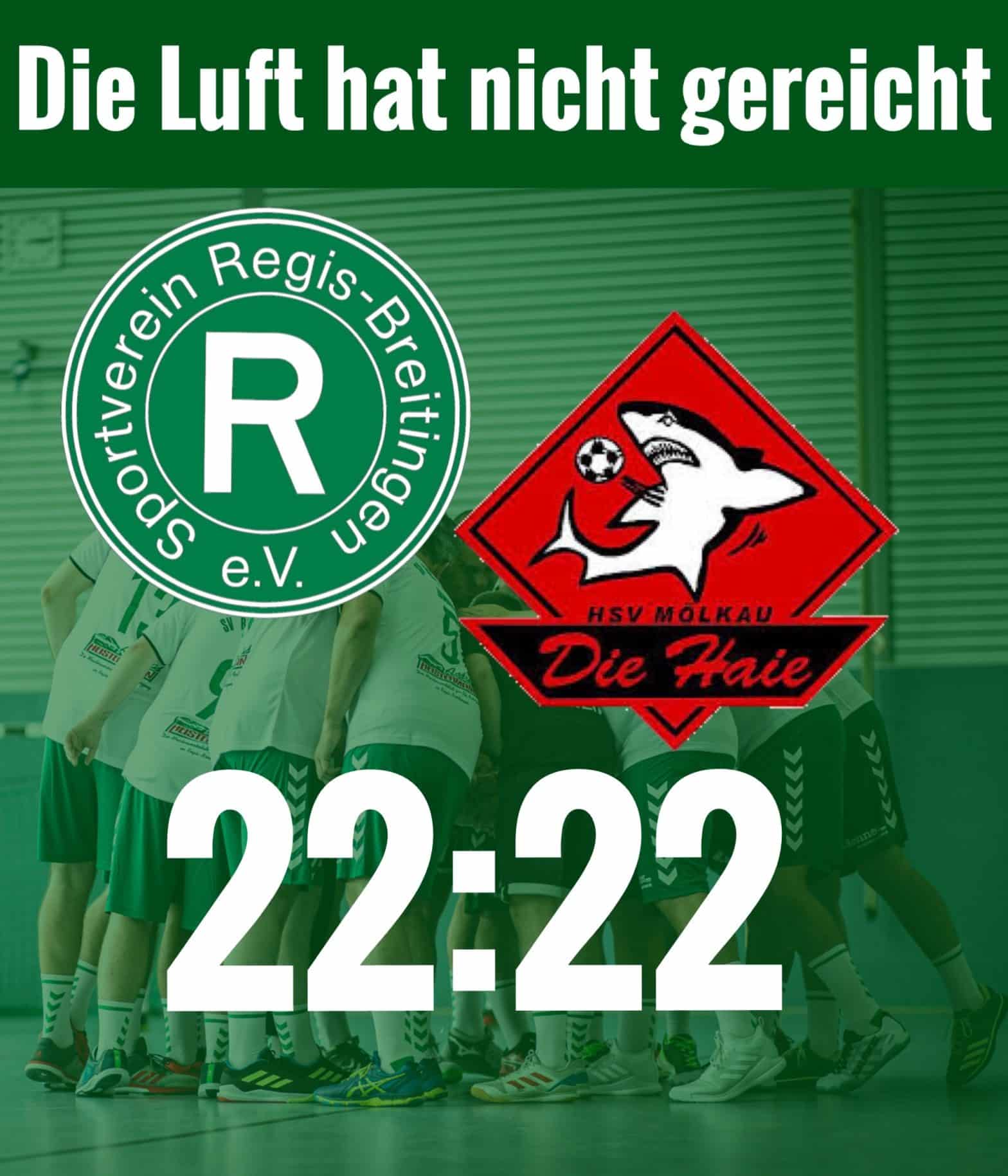 +++Die Luft hat nicht gereicht+++ Spielbericht Bezirksliga Leipzig 09.10.2022HSV Mölkau „Die Haie“ – SV Regis-Breitingen 22:22 (12:14) Dem Sieg so nah und doch so fernLeipzig/Mölkau. Am 4. Spieltag der Bezirksliga Leipzig hatte der SVR den bislang ungeschlagene Tabellen Zweiten aus Mölkau vor der Brust. Die Devise für das schwere Auswärtsspiel war klar – „Gut mitspielen und dem …